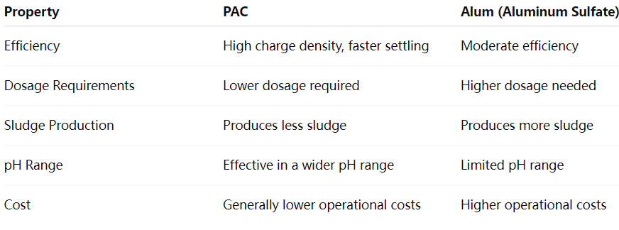 A differenza dei coagulanti tradizionali come l'allume (solfato di alluminio), il PAC è noto per la sua efficienza superiore e il tempo di assestamento più rapido nei processi di trattamento delle acque. Ha un'elevata densità di carica, rendendolo particolarmente efficace nel destabilizzare le particelle sospese e nel formare floc più grandi, che possono quindi essere rimossi attraverso la sedimentazione o la filtrazione.
